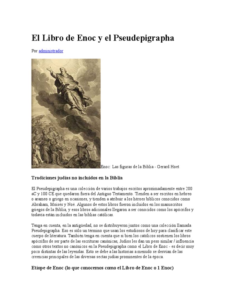 El libro de enoc es uno de los apócrifos más apasionantes que nos ha legado la antigüedad. Lee poco y serás como muchos. Aparece un sabio notorio o un profeta b�blico. El libro de enoc (o henoc) es un apócrifo seudoepigráfico intertestamentario que forma parte del canon de la iglesia ortodoxa etíope pero no es aceptado como canónico por las demás iglesias cristianas. Su contenido es principalmente simbólico, insinuando misterios cósmicos referentes a la historia de la especie humana.